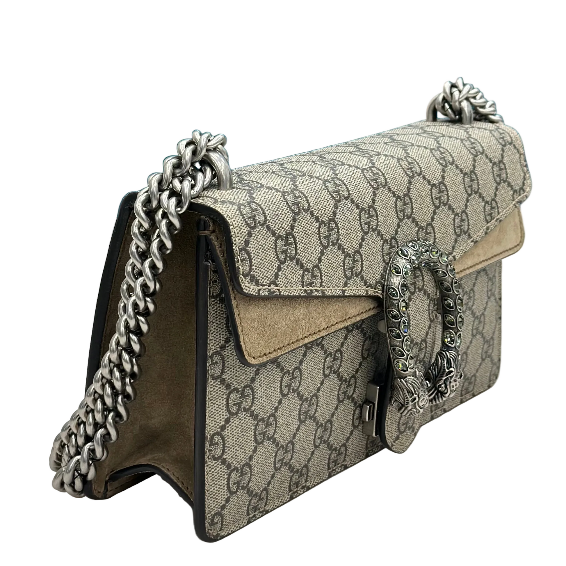 - Materiale: Realizzata in tessuto GG Supreme beige ed ebano, un materiale a ridotto impatto ambientale, con dettagli in pelle scamosciata (suede) color tortora.