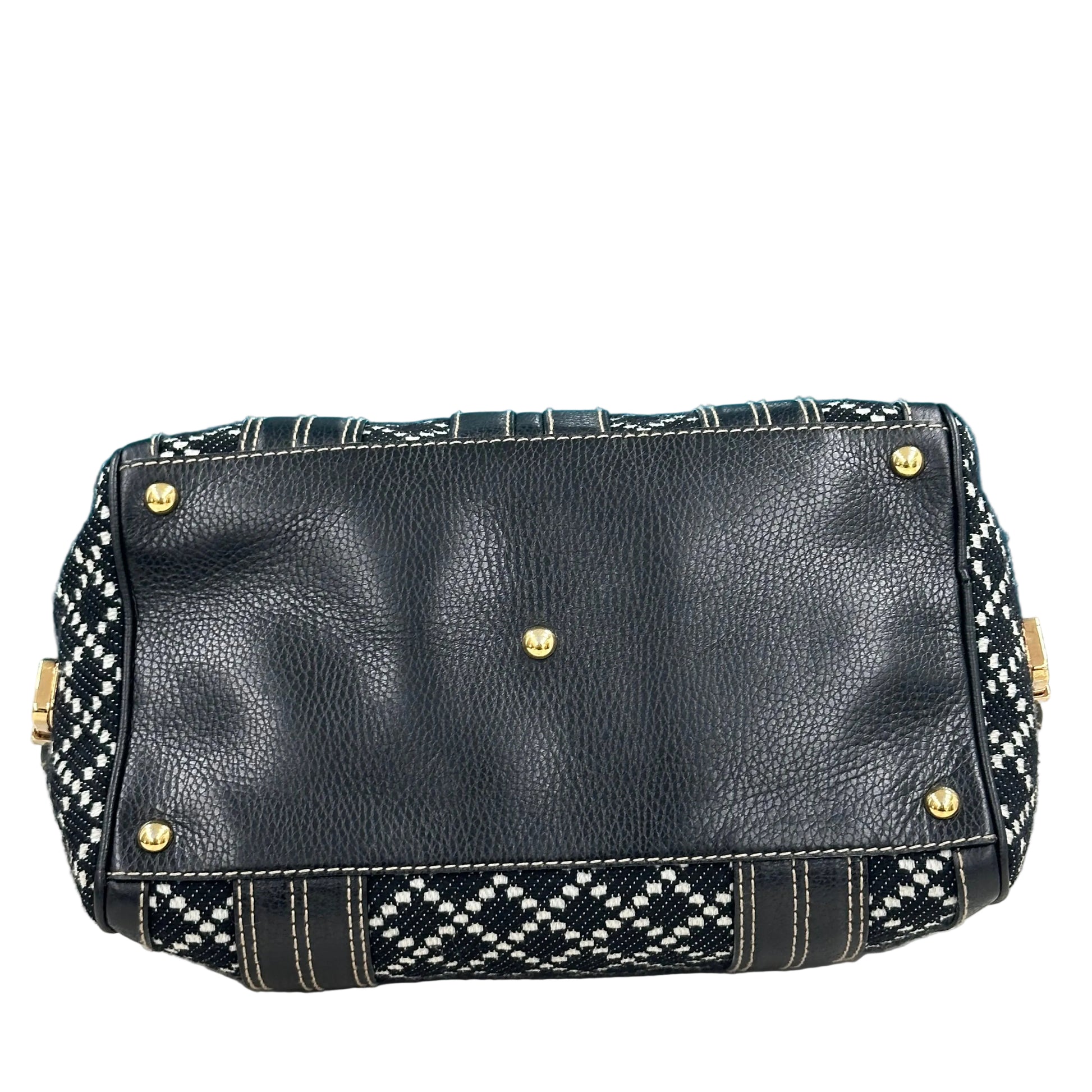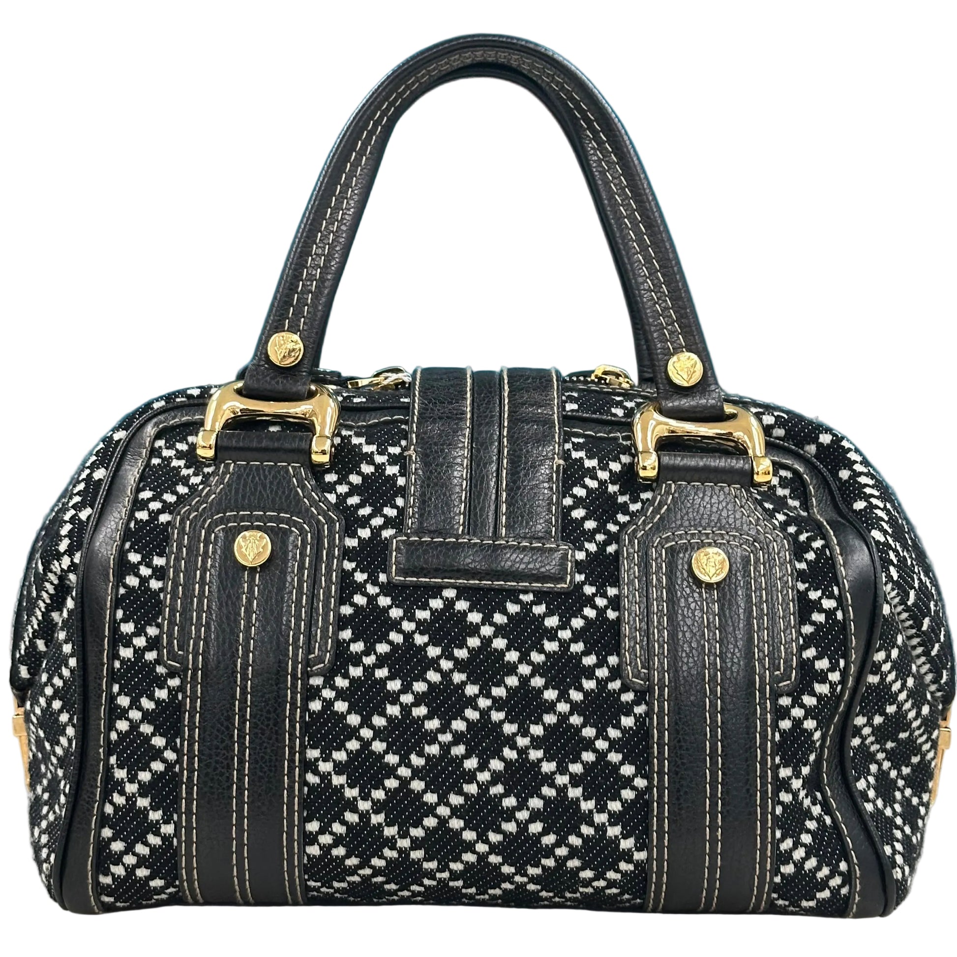 Gucci Aviatrix Heritage Boston, un modello distintivo caratterizzato da uno stile vintage degli anni 2000. Questo modello specifico presenta un corpo in tela (canvas) lavorata con un motivo a rete in bianco e nero, rifinito con dettagli in pelle nera e cuciture a contrasto bianche.