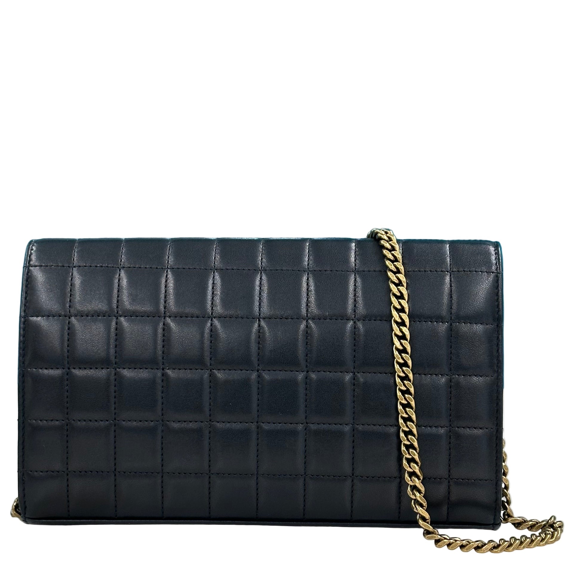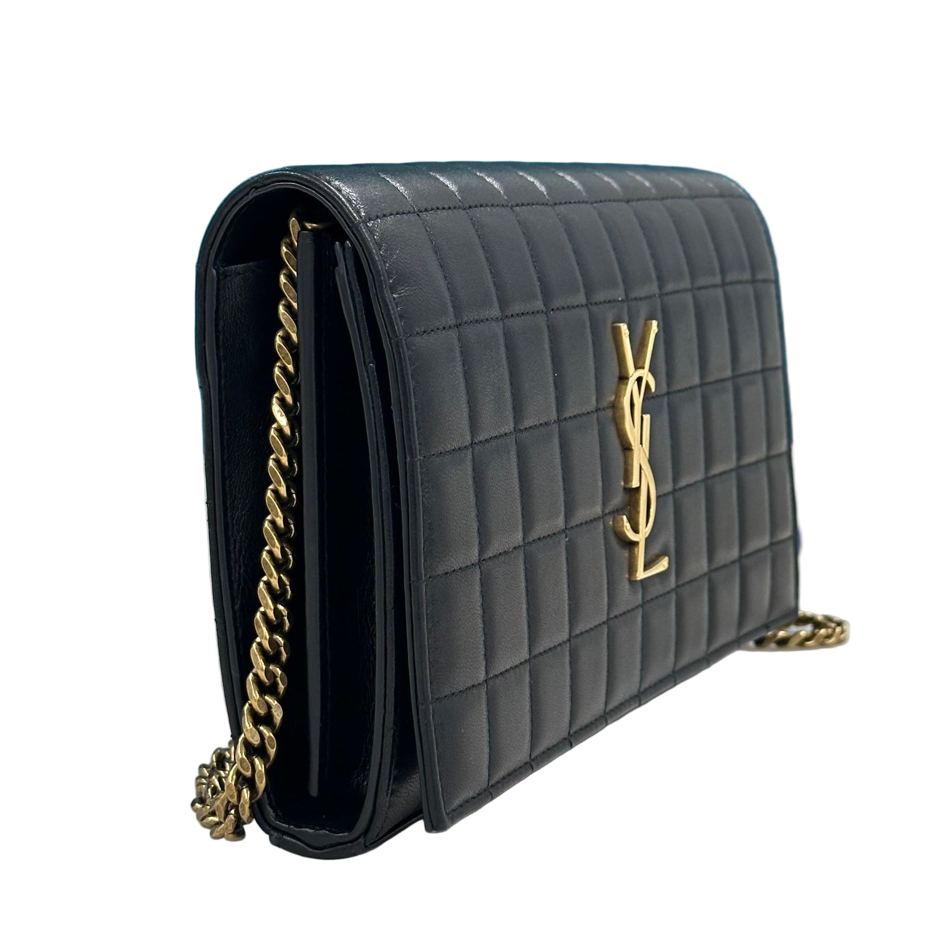 - Design e Materiali: La borsa è realizzata in morbida pelle di agnello trapuntata con un motivo a quadri, ed è decorata con l'iconico monogramma YSL in metallo color oro.
