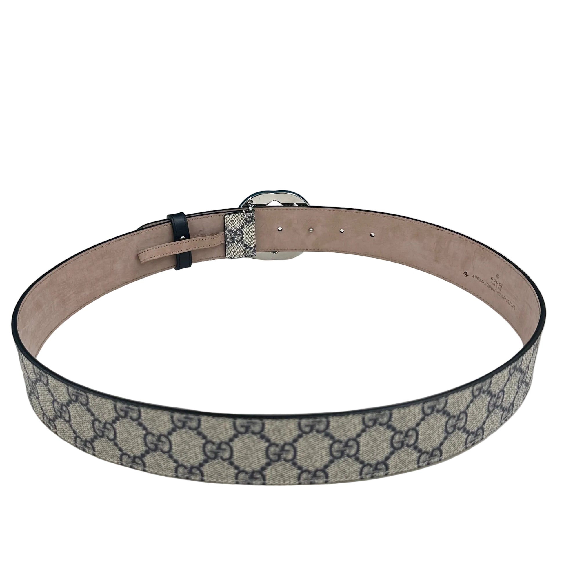 - La cintura è un modello Gucci GG Supreme con fibbia G incrociata(Interlocking G) color argento.