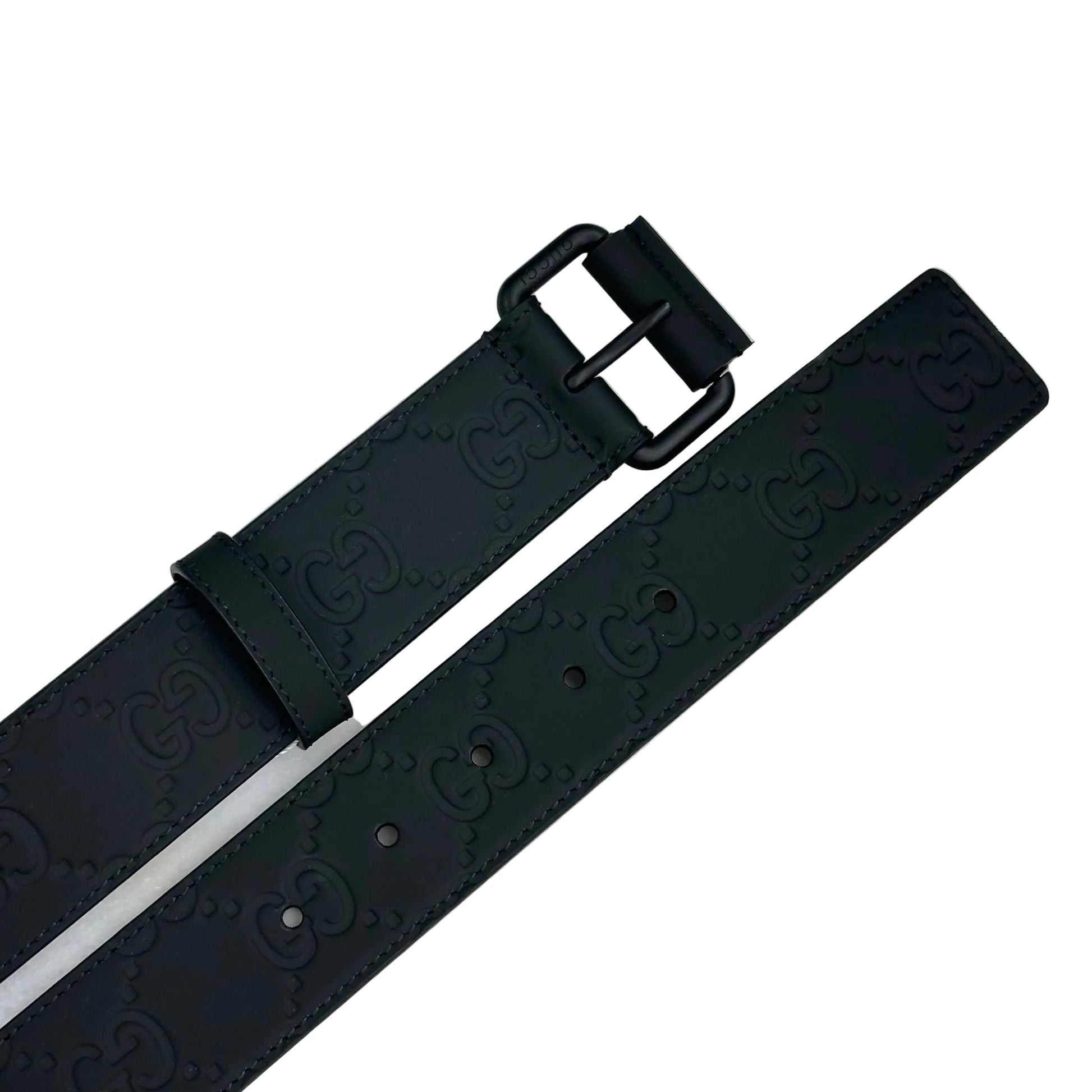- Cintura Gucci nera con una fibbia total black. Il motivo GG in rilievo è evidente sulla pelle, un elemento iconico del marchio noto come pelle Gucci Signature.