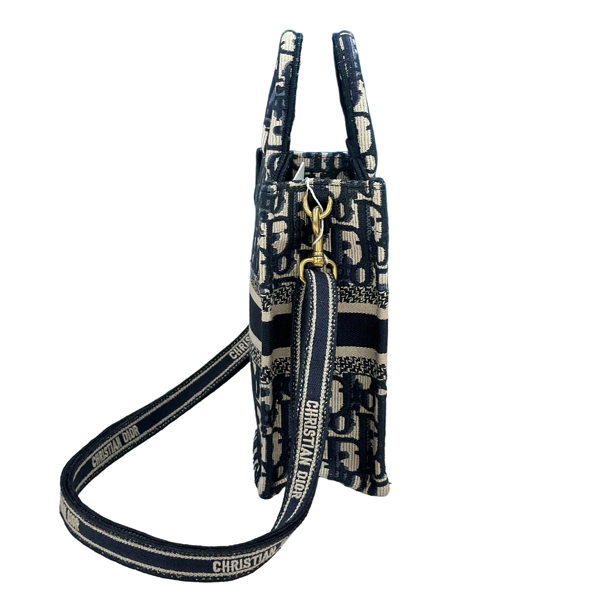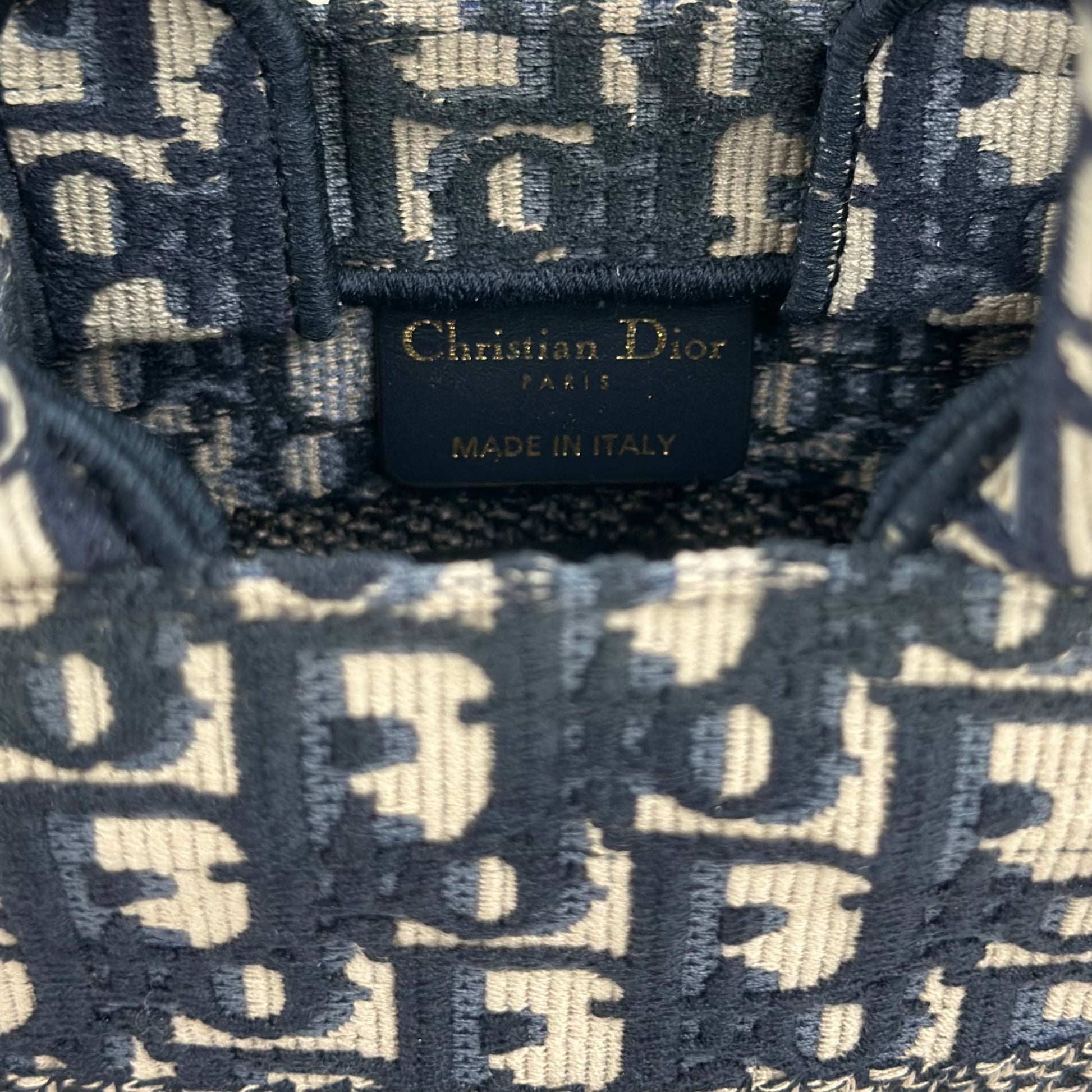- Mini borsa verticale Dior Book Tote, caratterizzata dal ricamo Dior Oblique blu.