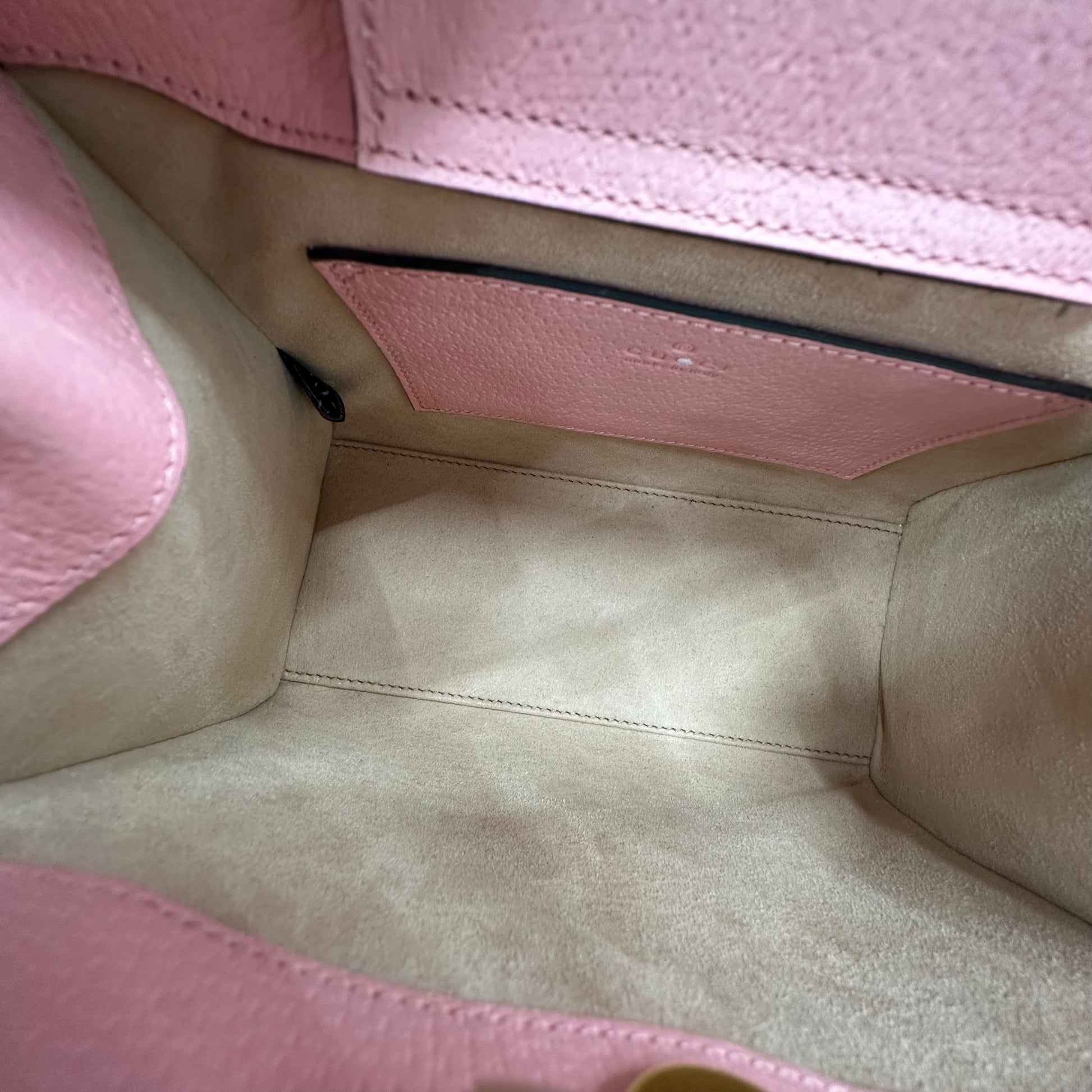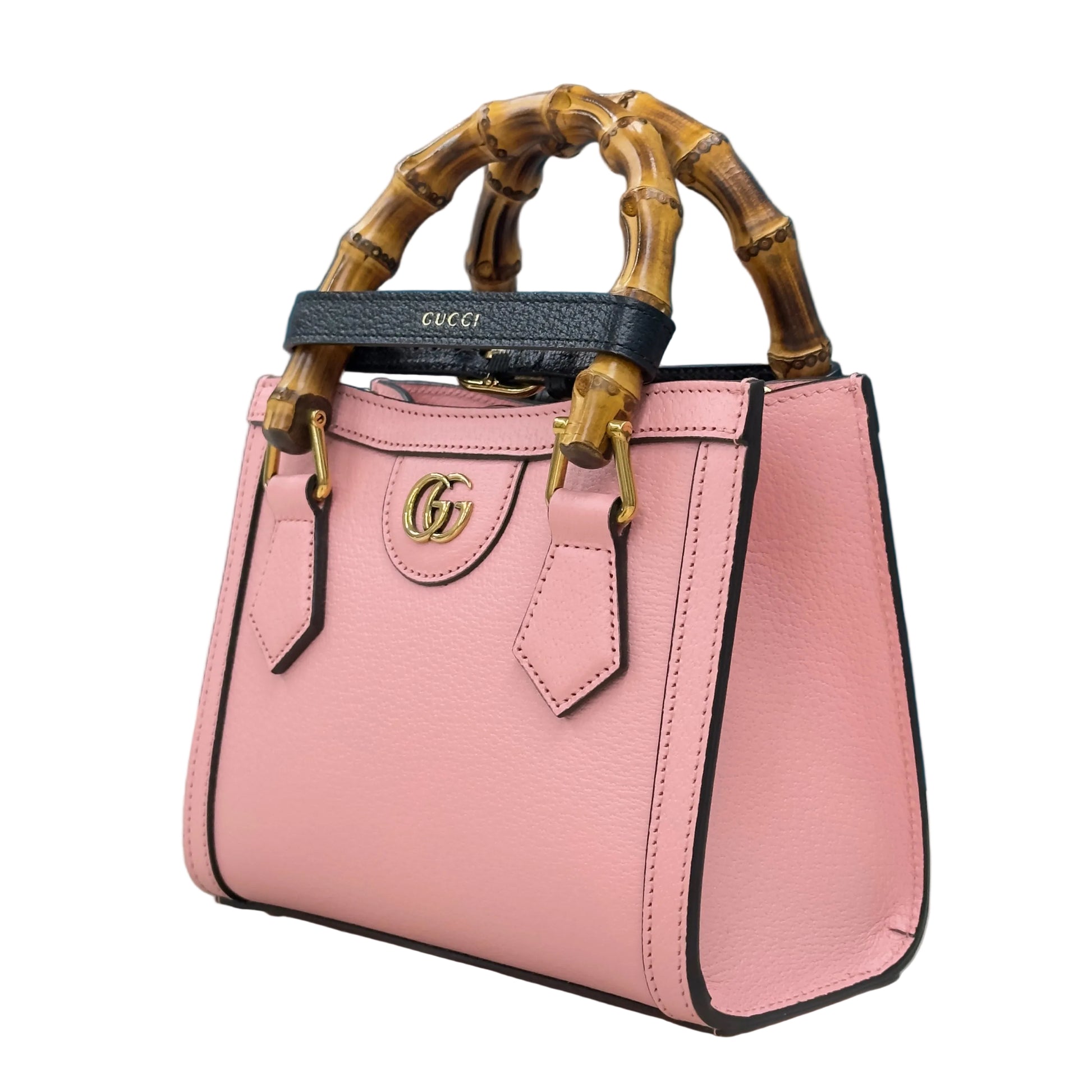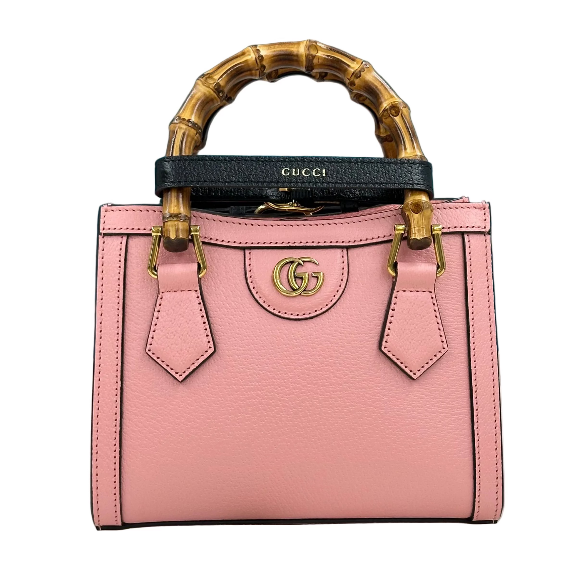 - Gucci Diana. È una tote bag in pelle rosa con i caratteristici manici in bambù e una tracolla in tessuto a righe rimovibile, parte della collezione Diana.