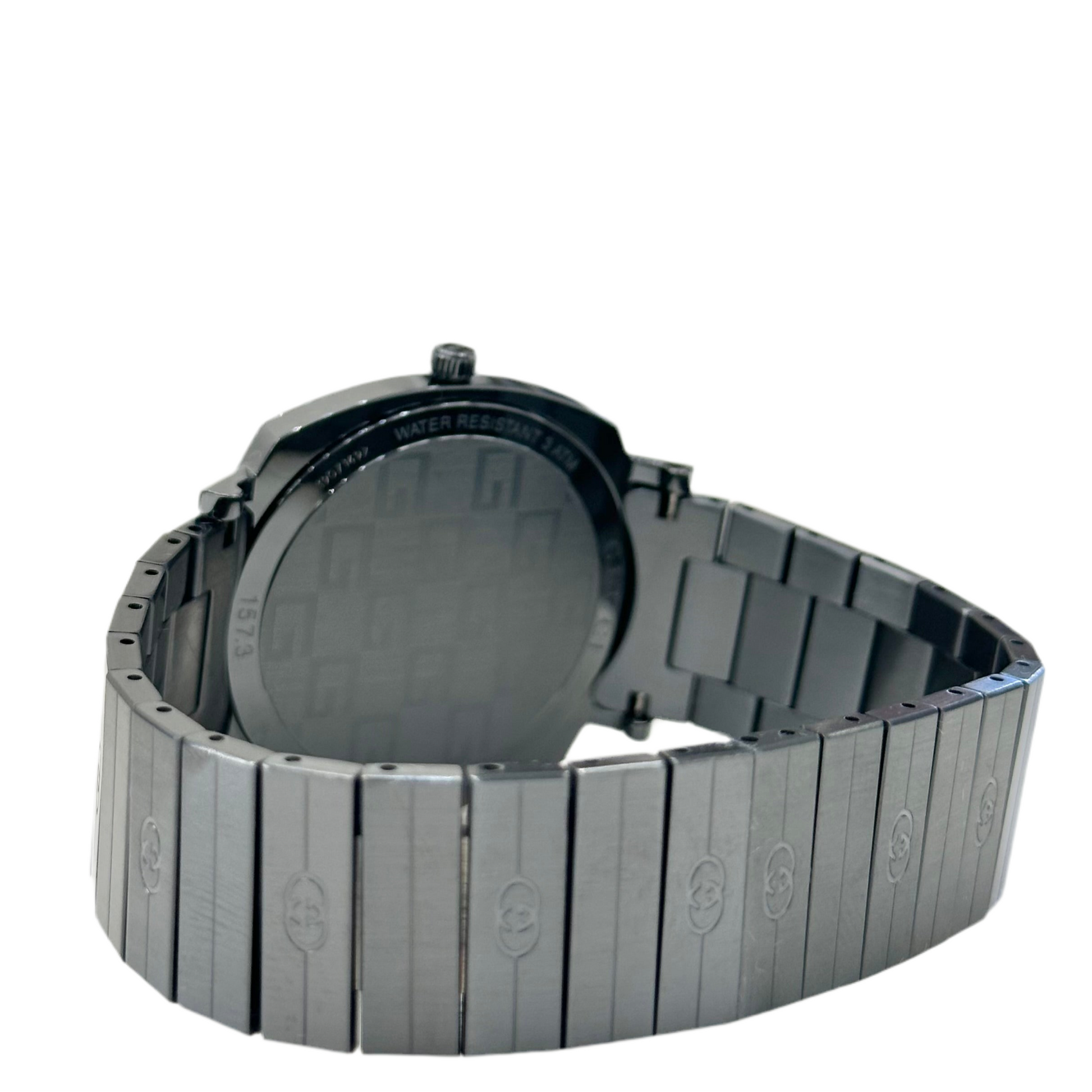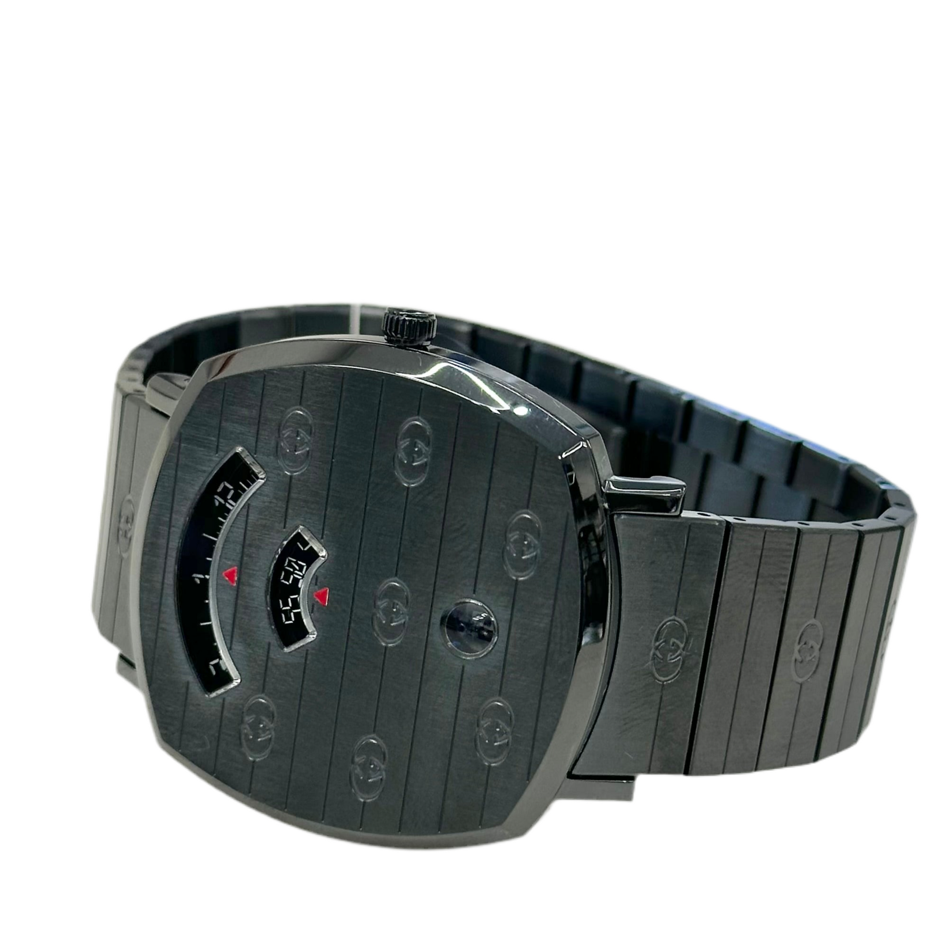 - L'orologio Gucci Grip, caratterizzato dal suo design unico a forma di cuscino arrotondato con finestre per l'indicazione dell'ora. Si tratta di un modello unisex con cassa e bracciale in acciaio inossidabile con trattamento PVD, con il motivo GG inciso sul bracciale e sul quadrante.