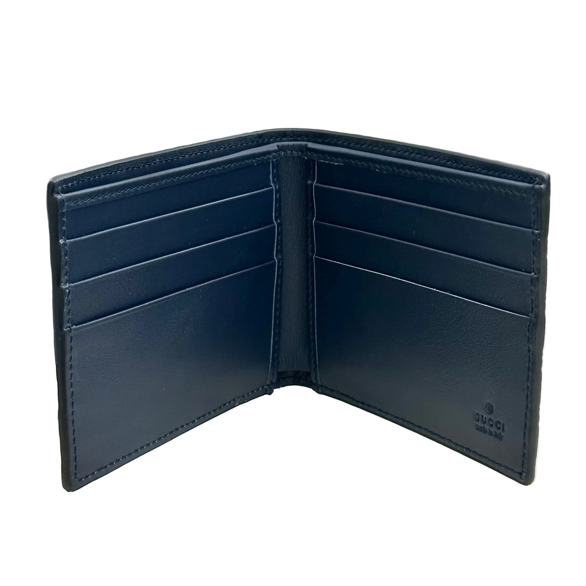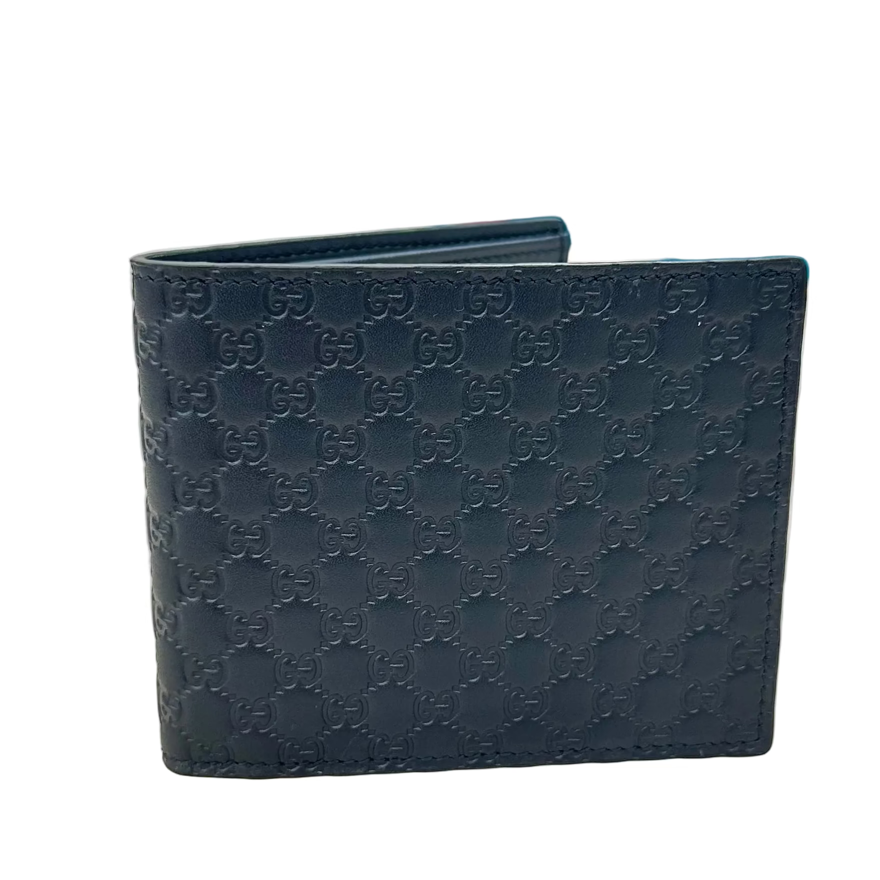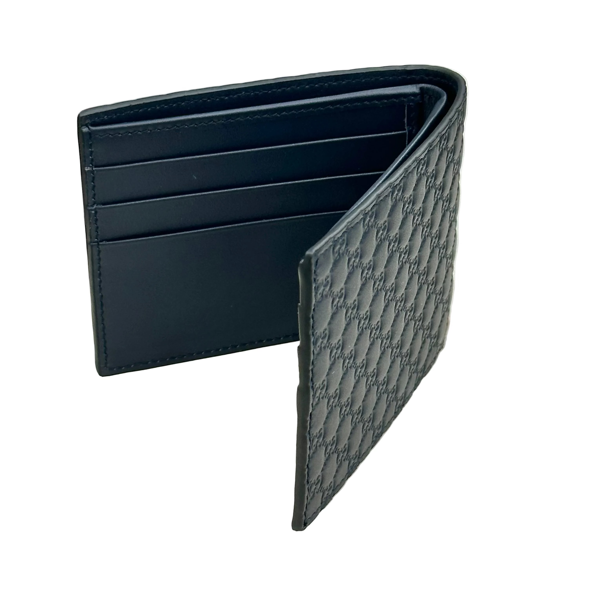 Portafoglio bi-fold Gucci Micro Guccissima di colore blu. È un accessorio compatto realizzato in pelle con l'iconico motivo GG impresso su tutta la superficie.