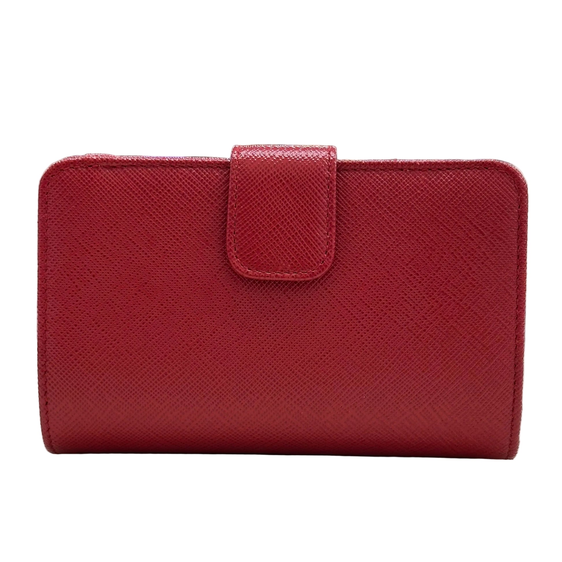 Portafoglio Prada in pelle Saffiano, un accessorio di lusso noto per la sua resistenza e il design elegante. Questo modello specifico è caratterizzato dalla chiusura con cinturino sul retro e dal logo metallico Prada sulla parte frontale.