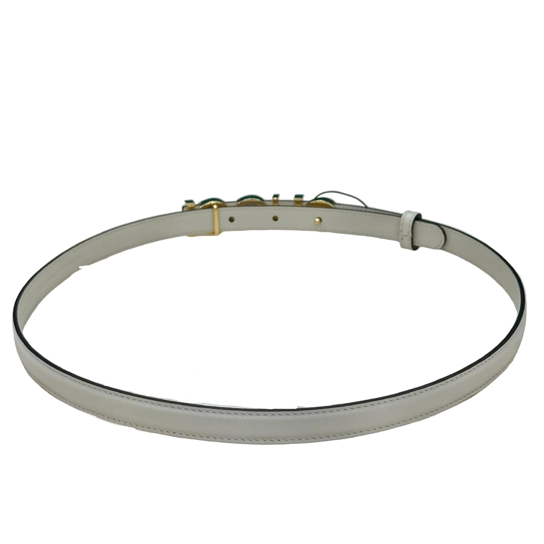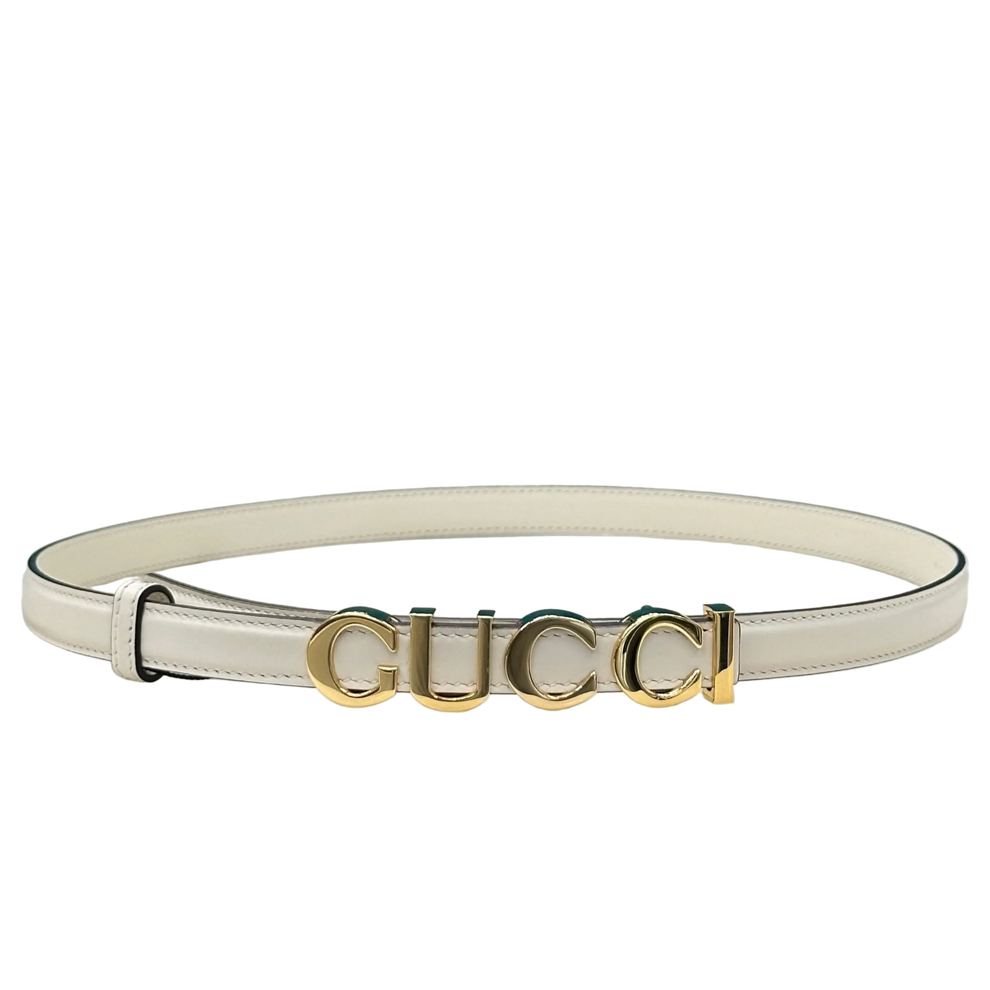 - Cintura sottile in pelle bianca di Gucci, caratterizzata da una fibbia con il logo testuale metallico in tonalità oro